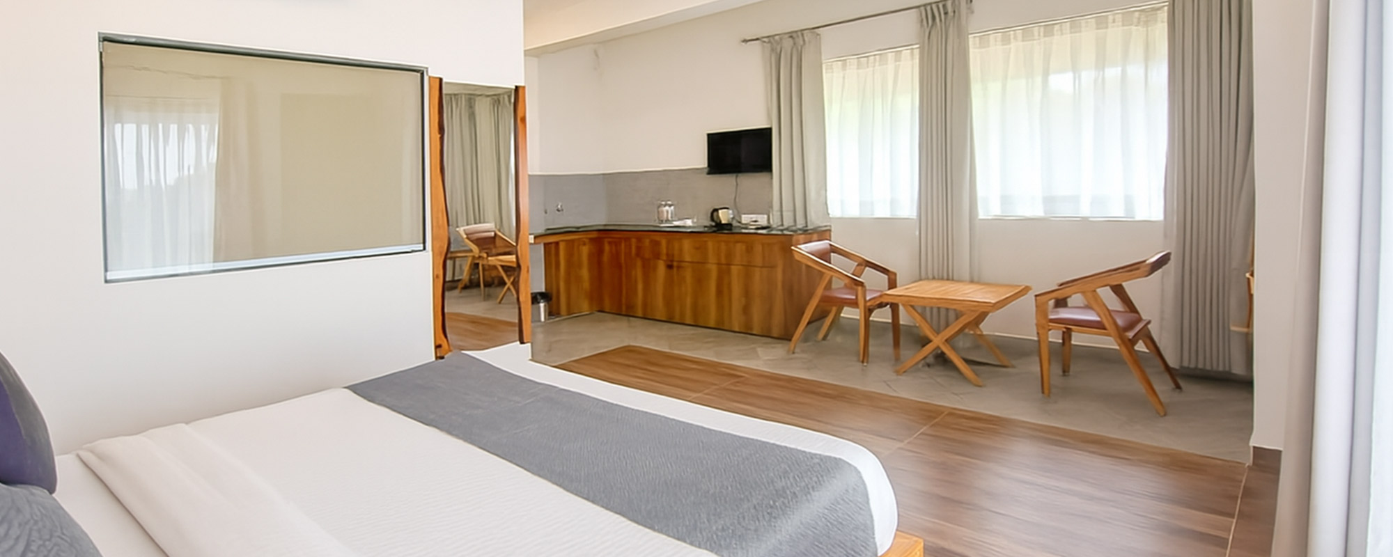 Experience unparalleled luxury in our 460 sqft Maharaja suite. Adorned with two large glass panes, it offers breathtaking views of mountains and lush greenery. Indulge in opulence as you relax in this spacious haven, surrounded by nature's beauty. Immerse yourself in the serene ambiance for a truly extraordinary stay.